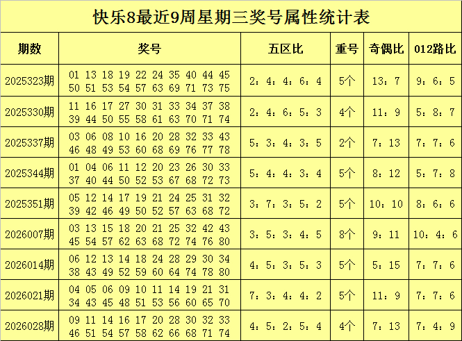 012路比分析:最近9周星期三奖号012路总比为65:56:59,最近3周星期三奖号012路总比为21:18:21,上周星期三奖号012路比为7:4:9。